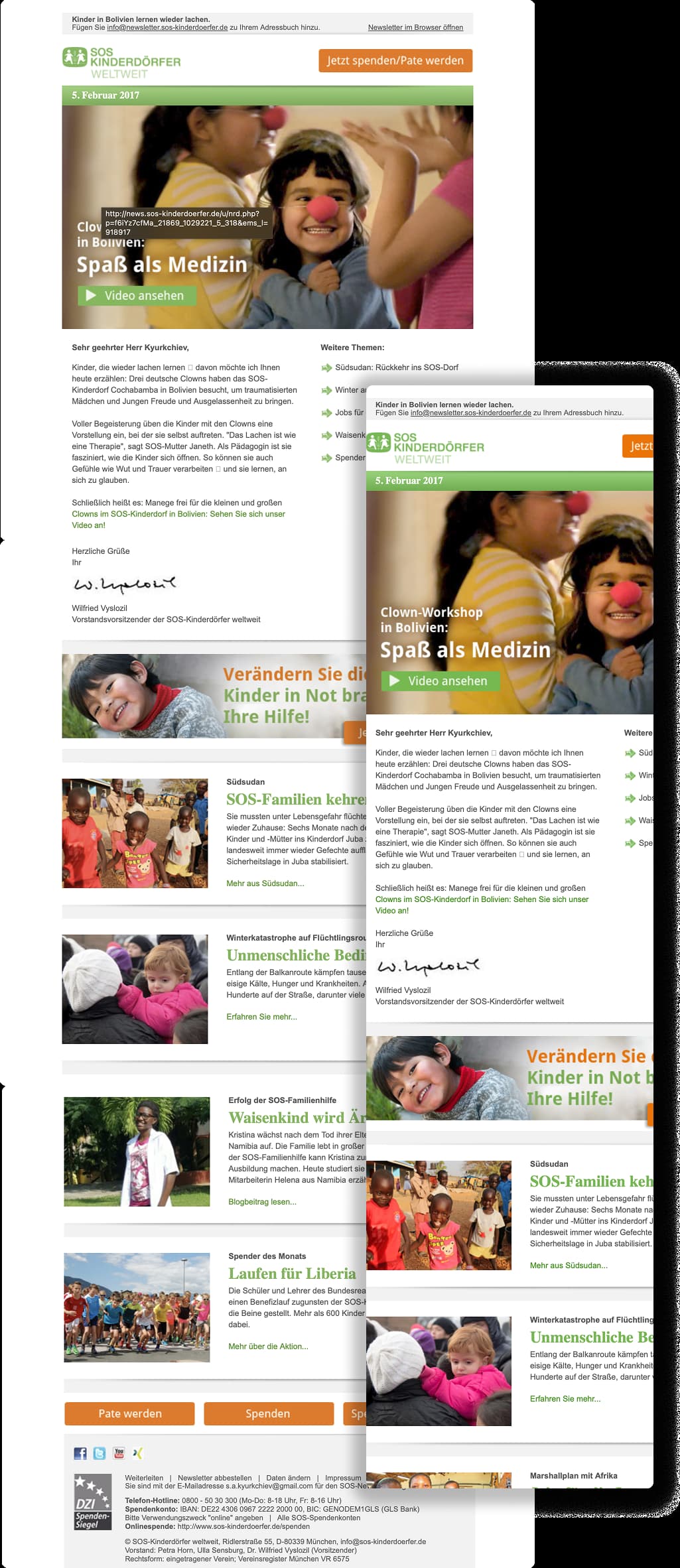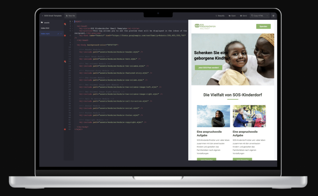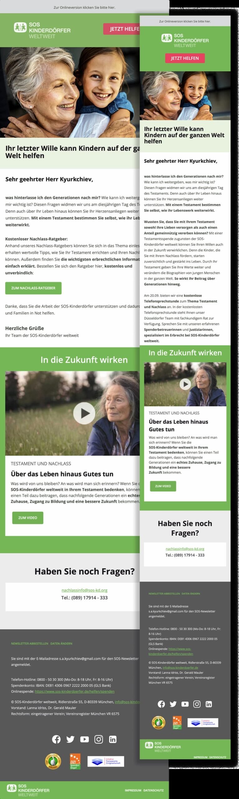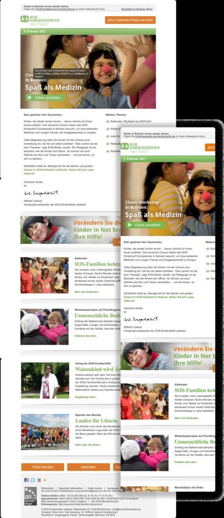 The tricky part was that this template had to be fully implemented into the Emarsys, Salesforce or Microsoft Dynamics 365 marketing CRM across the whole SOS Children’s Villages Federation (70 countries, 250 teams). And to make the challenge even greater, the email template also had to be templated and fully editable in common native email builders. So, ended up with every heading, paragraph, button, color, picture, and link in this template being editable, plus having the ability to add/remove different sections within the prebuilt templates for: